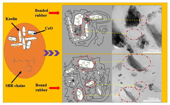 The static mechanical properties of pure SBR and CeOx/Kaol material filled SBR composites are shown in Table 4 and Table 5. Tear strength increased significantly as the CeOx loading content increased from 0 to 4%; this result is in agreement with the data of MH, ML, and ΔM. However, the tear strength showed a decrease trend when the CeOx loading content exceed 4%. The maximum tear strength value of 51.16 kN/m was an increase of 410.6% and 38.3% compared to pure SBR and SBR composite filled with raw Kaol, respectively. The tensible strength, 100% tensile modulus, 300% tensile modulus, and 500% tensile modulus exhibited similar change tendencies. The tensible strength reached the maximum value of 12.85 Mpa, which was an increase of 811.3% and 35.9% compared to pure SBR and SBR composite filled with raw Kaol, respectively. The hardness had no obvious change with increasing CeOx loading content. These data indicate that the reasonable loading of CeOx on the surface of Kaol could improve the interaction between filler particles and rubber chains, thus restricting the motion of rubber chains and improving the mechanical parameters of filled SBR composites. Table 5 shows the static mechanical properties of SBR filled with different contents of CeOx/Kaol material. There is an increase in hardness with increasing CeOx/Kaol contents. The tensible strength and tear strength had a significant increase when the CeOx/Kaol content increased from 10 phr to 50 phr. These results could be attributed to the fine dispersion of CeOx/Kaol particles in the rubber matrix and the strong interactions between filler particles and rubber chains, which constrained the motion of the rubber chains when the resulting composites were stretched. However, the mechanical characteristic overall presented gradually decreasing tendencies as the filler content changed from 50 phr to 80 phr, which may be attributed to the aggregation of CeOx/Kaol particles in the rubber matrix system at high content. These data indicated that CeOx/Kaol material can significantly reinforce the mechanical properties of the filled SBR composites at reasonable CeOx loading content and filler content. First, the loading of CeOx particles changes the surface property of Kaol. The interaction between rare earth elements and the double bonds in the rubber chains due to 4f shell structure could improve the incorporation between rubber molecules and filler particles, which could improve the restriction on the motion of rubber molecules during the stretching of filler composites. Second, the inorganic Kaol particles with rigid properties having strong interactions in the rubber matrix could prevent the propagation of cracks during the tearing process. Third, many rubber chains trapped between the layer-like particles forming the bonded rubber possessed a rigidity similar to the kaolinite filler. Therefore, increased filler content in the composite could carry much more stress and improve the tensile strength. The reinforcement mechanism is displayed in Figure 8.