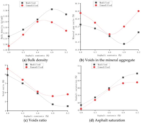 After determining the reasonable content of the modifier in a certain asphalt content range, the modified Marshall method was further used to determine the optimum asphalt content [28]. The index results of CAM with 7.5% and without SEBS were compared, as shown in Figure 10.