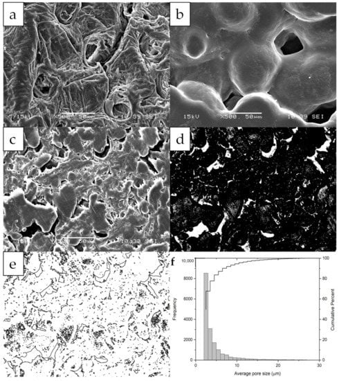 The SEM micrographs for CS, PCL, and MCP (Figure 2a–c) evidence that CS and PCL blended heterogeneously in the MCP. The extrusion process drove the melted PCL to settle between solid-milled CS particles (Figure 2c). Similar behavior has been observed by Correlo et al. [36] when CS melted with polyesters showed agglomeration of CS fibers, probably due to insufficient torque during blending. In our work also, during the injection molding, several internal, tiny, and densely distributed pores were formed by aggregation and agglomeration. This influences the bulk density and mechanical properties without a significant contribution to the fluid flow [37]. The low N2 adsorbed volume observed in the physisorption isotherms is additional evidence (Appendix B), and hysteresis and pore filling and emptying were not evident. The pore volume of vapor adsorbed, Vp, was 0.004 cm3 g−1 and the specific surface area resulted in 2.09 m2 g−1 at a relative pressure close to one (e.g., p/p0 = 0.98). The MCP displayed open pores having slit shapes with curved channels with one and two ends, which were larger than other closed ones. An APS of 4.68 ± 3.27 μm and a surface porosity of 5.10 ± 1.12% were estimated by image analysis of cross-section SEM micrographs (Figure 2c–f).
