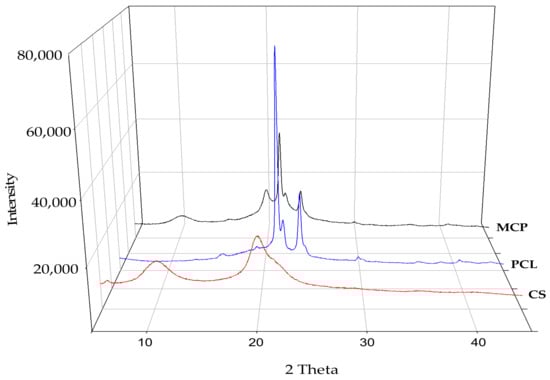 XRD patterns of PCL, CS and MCP.