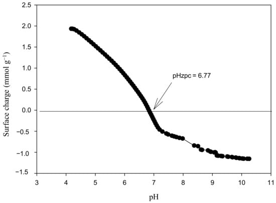 The proton binding curve of MCP (Figure 4) shows that the pHzpc was 6.7, which is close to the pHzpc of CS (pH 6.3). The surface became negatively charged at pH > pHzpc, thus increasing the metal cations removal efficiency [16]. ZnSO4, FeSO4, Cd(NO3)2, and Pb(NO3)2 dissolved in water provided positively charged metal ions, and the amine groups of MCP were still protonated at a pH of 6, exerting repulsions to a certain extent. Therefore, the electrostatic interactions between the adsorbent and adsorbates might not be relevant in the adsorption process and aid the complex formation of the divalent metal ions with amine, carboxyl, and hydroxyl groups with non-shared electron pairs. It is worth noting that according to Cu speciation at a pH of 6, only a minor fraction remained as a divalent ion, while the major was either in the neutral or solid form, i.e., a small amount adsorbed, and the rest precipitated as salt. Similarly, for Al(NO3)3, at this pH, the metal speciation was in the passivation state (Appendix D) [41].