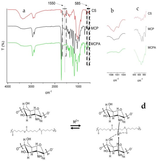 FTIR spectra of CS, PCL, and MCP, before and after adsorption treatment (MCPA) (a), 1650–1400 cm−1 (b), and 650–550 cm−1 regions (c), and proposed adsorption mechanism (d). The grey box represents N-H bending vibrations. The black box shows the stretching vibrations of the metal ion-MCP complex.