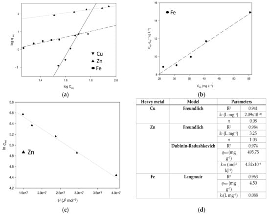 where qeq is the equilibrium adsorption capacity (mg g−1), kF is the adsorption affinity constant (L mg−1), n represents the system’s heterogeneity and Ceq is the concentration of the metal ions (mg L−1) at equilibrium.