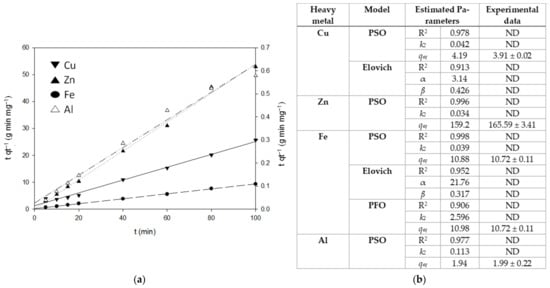 Adsorption kinetic parameters were estimated by fitting the experimental data of qt to the pseudo-second order (PSO) model (Equation (10)), the Elovich model (Equation (11)) and the pseudo-first order (PFO) model (Equation (12)) [30]: