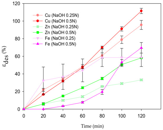 From the εdes shown in Figure 9, after 120 min of treatment, almost 100% of the Cu(II) desorbed with both EDTA solutions (Section 2.5). The 0.5 N concentration of NaOH allowed for a more efficient desorption process (p < 0.05) than that with 0.25 N, which contrasts with Wang et al. [27], who proved that a low concentration of NaOH was desirable for full desorption. The εdes with HCl (0.5 N) reached the highest values of 53.43 ± 9.72%, 11.96 ± 1.94%, and 41.81 ± 12.05% for Fe, Zn, and Al, respectively. Nonetheless, the E% after the desorption process in acidic conditions (HCl 0.5 N) was also the highest, representing a disadvantage for the MCP reusability. In the case of the desorption process with HNO3, 0.05 N and 0.5 N achieved the complete desorption of Fe without MCP mass loss. Nonetheless, MCP lost its original form and destroyed the pellet, confirming that the adsorption mechanism was mainly due to electrostatic interactions [1]. The highest εdes for Zn was 8.6 ± 1.53% and for Al was 3.23 ± 0.2% with 0.1 N. The εdes values with acidic solutions are shown in Appendix G.