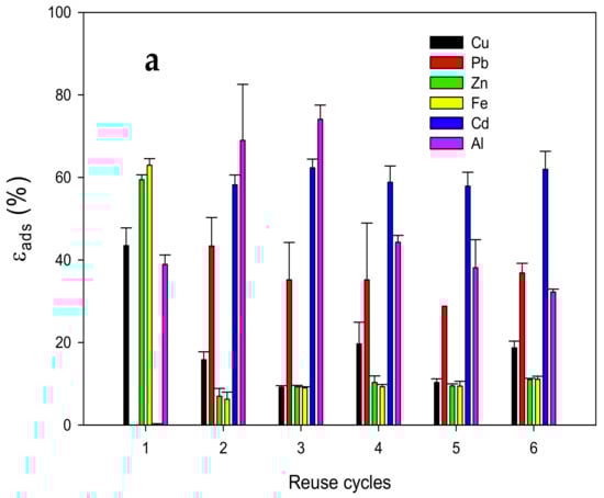 The reusability of MCP was proven by adding MCP in synthetic solution for an adsorption cycle, and subsequently, desorption was carried out with an EDTA/NaOH 0.5 solution for a total of six cycles (Figure 10). High εads values were observed in the first cycle for Zn(II), Fe(II), Al(III), and Cu(II), which agree with the kinetic studies previously discussed (59.4 ± 1.2%, 62.9 ± 1.5%, 43.4 ± 4.3%, and 38.9 ± 1.2% respectively). The first desorption cycle achieved the release of 100% of the Cu(II) and Al(III) adsorbed in the MCP. Zn(II) and Fe(II) only desorbed 80% and 68%, respectively. In further reuse cycles, the εads values of Zn(II), Fe(II), and Cu(II) decreased considerably possibly due to the incomplete desorption of MCP, owing to MCP’s high affinity for these ions. Surprisingly, from the second cycle, the εads values of Pb(II) and Cd(II) rose 43.3 ± 6.8% and 62.3 ± 2.1%, respectively, and remained constant until completion of the six cycles. For CS-metal ion complexes studied for the adsorption of other metal ions [63], it was reported that the adsorption efficiency improved because the CS-metal complex acted as a hard base with an affinity for hard acids such as Pb(II) and Cd(II), which explains the adsorption of these ions by Zn(II) and Fe(II) adsorbed in MCP after the first desorption cycle.
