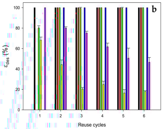 Six cycles were carried out for the reusability of MCP at the conditions mentioned above using for adsorption aqueous synthetic solutions (Section 2.4.2) and, for desorption, the solution with the highest εdes. The adsorption efficiency (εads) at every cycle was calculated using Equation (14):