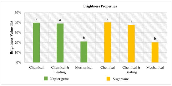 Brightness values of produced laboratory paper handsheets. Means followed by the same letter (a, b) in the same column are not significantly different at p ≤ 0.05 according to Tukey’s multiple comparisons test.