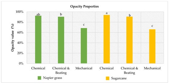 Opacity values of produced laboratory paper handsheets. Means followed by the same letter (a–c) in the same column are not significantly different at p ≤ 0.05 according to Tukey’s multiple comparisons test.