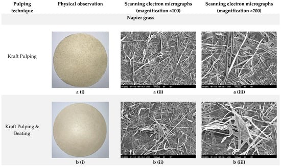 Undoubtedly, a higher lignin content necessitates a large amount of energy and chemicals []. The presence of lignin is detrimental to the stability of chemical and mechanical paper properties []. It was even necessary to bleach for some applications. The lignin content of Napier grass is 21.77% and that of sugarcane is 24.32%, both of which are low, implying that both biomasses ought to be fairly easy to pulp than wood with a lignin content of 26–30%. Furthermore, biomass fibre with a low lignin content is easier to delignified and requires milder and faster cooking conditions []. With the additional mild NaOH pre-treatment to the mechanical pulping process, the lignin content was greatly reduced. Ultimately, the high cellulose and low lignin and extractive content of non-wood resources of Napier grass and sugarcane stem qualify them as promising raw materials for pulp production. This result is benefitted by using low-cost biomass and, more notably, environmentally benign pulping processes (with mild chemical usage from the mechanical pulping process), which could be the new market trend for the pulping industry.