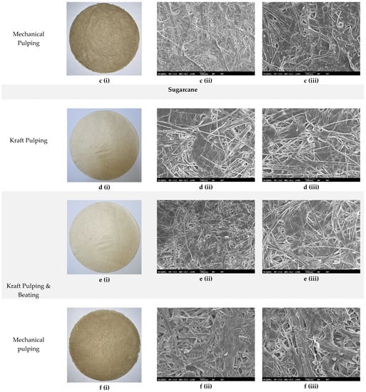 To better comprehend the distinctions between the laboratory paper handsheets, this study depicts SEM images of laboratory handsheets from Napier grass and sugarcane. Long-fibre materials, as shown in the SEM image of the laboratory handsheet, were made from Napier grass (Refer Figure 4a). The mechanical properties of the paper are influenced by the length of the fibre. According to Gomes et al. [], long fibre will improve the mechanical properties of the paper. Long fibre pulps have high folding endurance because they have more fibre joints that are able to form a strong network as well as a larger surface area to form bondings with their length spans and width of the fold line [,]. The strength of the fibre itself is affected by the packed arrangement of the fibre matrix on the surface and fibre of Napier grass. Inside the Napier grass, there were many matrix fibres and long fibres that crossed with each other (Figure 4b). In this study, lower tensile and tearing indexes occurred in laboratory paper handsheets produced by chemical pulping. As a result, additional mechanical treatment, including the use of beating, could well be needed to improve the paper properties. Paper with an additional beating process has significantly higher paper strength, as shown in Table 3. The improvement could be attributed to the changes in fibre structure induced by the beating process. The SEM results reveal that the additional beating process causes the fibres to be drawn toward each other, resulting in a more robust fibre network that contributes to good paper strength. The long fibre (Figure 4b(ii)) and abundance fibre (Figure 4b(iii)) from Napier grass pulp has greatly contributed to the folding test value.