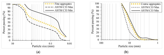 Granulometry (a) fine aggregates (b) RCA (C33 indicates the ASTM code, C33 Max and C33 Min indicate the maximum and minimum allowed passing percentages from the specific standard sieves).