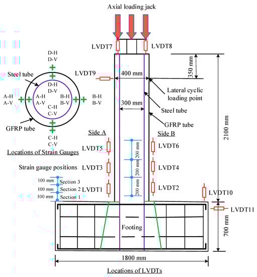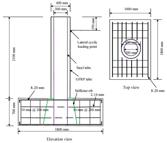 The specimens used in this study were made to form a semi-column with a cantilever at one end and a fixed end. Hand layup procedure was used to fabricate the test specimens. The quasi-static load was applied to the cantilevered end of the specimens. A base was mounted to the base of the column section to examine the seismic effect, while the upper end of the column was employed to give both cyclic and axial load. Under quasi-static stresses, five FGSTC specimens with circular glass-FRP and STT were examined. The specimens were encased in GLT with an internal diameter of 400 mm and a wall thickness of 4 mm internally. The STT was used with a 300 mm wide and an 8 mm or the 10 mm plate thickness. The specimens had a height of 2800 mm, with 700 mm for the base and 350 mm for the apparatus. The useful height of FGSTC columns for testing was 1750 mm, measured from the point of lateral load to the top section of the base footing. The footing was 1000 mm × 1800 mm in size when viewed from the upper side. The geometric model and elevation views of the FGSTC specimens are shown in Figure 2.