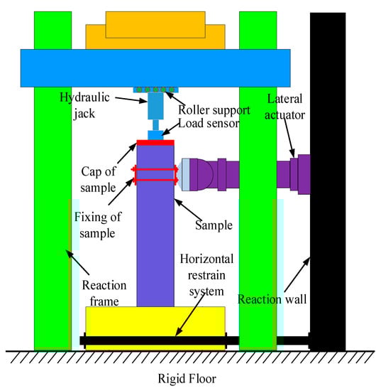 The test apparatus, sampling, and analysis setup under quasi-static loads are shown in Figure 3. The RC balance used four steel bolts to secure the specimen’s base surface from the bottom. The compression performance was provided by a reaction frame with the highest ACS of 5000 kN in an upward position. The compression load was placed on the top surface of the specimen by a jack with the highest ACS of 3500 kN. The jack was mechanically structured, and a compression sensor beneath the load jack was linked to a data logger (TDS530, Tokyo Measuring Instruments Laboratory Co., Ltd., Tokyo, Japan) so that the compression could be monitored continuously. The load jack and the efficiency frame are connected by a movable assist, which allows the specimen head to move along the side while maintaining uniform strength. In addition, a column cap was placed on the specimen’s uppermost point under the sensor to ensure that strength was transferred evenly from the load jack to the specimen. A massive efficiency divider on a level plane provided horizontal efficiency. After the strength of concrete was set to the desired value, a horizontally positioned actuator of the load apparatus was used to apply transverse load with a tensile capacity of 2000 kN and a compression threshold of 3000 kN (Suzhou Zhubang Measurement and Control Technology Co., Ltd., Beijing, China). The specimen head was connected to the horizontally positioned actuator via a specially designed installation that accepted the column. The data was recorded using a data logger attached to a computer.