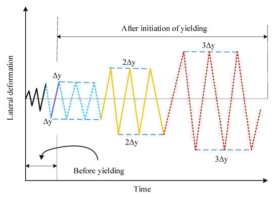 In this investigation, the compression load was performed employing the load-controlling approach at one kN/s. This load speed was enhanced until the desired compression strength was achieved, after which it was maintained constant throughout the experiment. The specimens are subjected to lateral dynamic load by following the displacement control techniques shown in Figure 5. After that, the displacement ameliorates of the cyclic load was considered equivalent to the yielding displacement (as represented by the nonlinear graph). The cycling procedure was executed three times. This dynamic load approach was sustained until the load was reduced to 85% of the specimen’s maximum strength. The visible fissures were visible at this point, and the specimen’s deformations had grown too great to withstand the imposed loads.