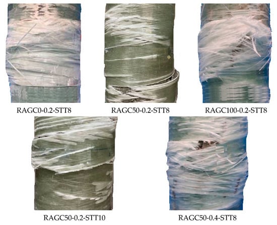 Circumferential fractures in the GLT cracks in the STT, and flattened RAGC were all common failure and cracking patterns in all of the specimens. The three phases of the damage interaction are the flexible phase, the crack development phase, and the destructive phase. The transverse deformation of each specimen was initially mild, comparable to the stresses from both tubes resulting from the application of loads (GLT and STT). The strains in both tubes (GLT and STT) continuously ameliorated as the transverse load ameliorated, accompanied by infrequent tiny breaking sounds. Soon after, the specimen’s horizontal resistance was no longer elastic, with constant increments indicating the specimen had progressed to enhance the fracture phase. Slight circumferential fractures appeared on the outside of the GLT, accompanied by loud breaking sounds. When the lateral diversion reached around 2δy, the major obvious fractures in the GLT were identified. The strands’ bending sites corresponded to the observed points of substantial cracks in the GLT, demonstrating that the tar framework fractured before the threads. As the lateral stress ameliorated, the fractures accumulated at the column’s foundation, and a few severe fractures with a total width of 3 to 5 mm developed on both sides in an area larger at 150 mm and ending at 350 mm from specimen end (B and A). The threads that are obstructing the resin incorporation at this time refuse to cooperate and easily break. Surprisingly, before the threads shattered, the points of several cracks around them shifted to the level course, implying that the thread’s stiffness had been fully utilized. The fractures on the elastic face expanded very quickly, and some substantial fractures of identical magnitude on both sides of the specimen (B and A) cooperated to accelerate damage progression. The RAGC within had been squished and was now exposed. Before reaching the limit, the application of loads improved steadily. As a result of the accumulating fractures on the GLT and the RAGC, the specimen’s longitudinal axial load capacity began to deteriorate progressively, and the specimen entered the damage phase. The GLT fibers were more shattered during this period, and the core concrete crushing was more obvious. Figure 6 shows the failure modes of some samples.