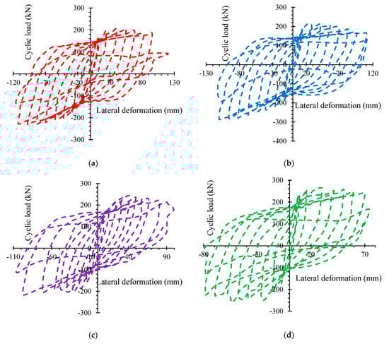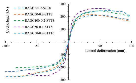 Figure 8 depicts the lateral load-lateral deformation graphs for all examined specimens. Three times, the cycling procedure was executed. The load was reduced to 85% of the specimen’s maximum limit using this cyclic load method. The visible fissures were visible at this point, and the specimen’s deformations had grown too great to withstand the imposed loads. The testing materials in this investigation were initially exposed to axial compression stress before being subjected to lateral cyclic load. The longitudinal load restriction is lessened when the specimen bends towards one section. When the specimen bends towards the other portion, the parallel load limit is ameliorated. This is transcending because the items in the specimen had failed in previous load rounds. The minor fractures of the specimen were gathered at a specific place by advancing the transverse loads, resulting in inconsistent damaged reductions for sides B and A due to non-homogeneity of components and varying local buckling functioning of the STT [56,57]. As a result, the specimen’s strains developed irregularly on these different sides. Plastic distortion performance and energy limitation dissipation were unsurpassed in fully adjusted hysteretic loops. The specimens had essentially no residual deformation before the STT began to give, and the hysteretic loops revealed decreased gaps across the transfer of axial and lateral cyclic stress. The elastic correlation can be used to represent the specimen deformation in this period. The energy dissipation of the specimens was neither apparent nor predictive of a reduction in loading capability. When the STT was yielded, growing compression caused residual stresses and gaps in the hysteretic loops to enlarge, although the load inclines or dumping curves decreased. At the initial load loop (earlier the horizontal deformation had reached 7δy), three hysteretic loops for each of the load fix loops were generally covered. The axial load-carrying capacity and stiffness peaked for transverse deformations between 4δy and 6δy. Because of the STT yielding or buckling failures, most specimens broke at lateral deformations of roughly 8–10δy. The three test variables have an impact on hysteretic functioning. As the RAGC replacement rate ameliorated, the maximum transverse deformation of the specimens dropped slightly. However, after attaining its maximum level, the horizontal load-carrying strength decreased even more slowly and without any abrupt reduction. The specimens with higher RAGC replacement rates had more compression, which could be due to the strength of RAGC. By raising the axial load fraction, the graph’s P-impact is maintained better with a greater compression load, resulting in extended longitudinal deformation and hence an amelioration in the bending moment. The specimens failed because of the simultaneous effect of bending moment and axial compression. The ability of specimens to withstand bending is reduced as axial compression is ameliorated. The greatest parallel deformation was reduced as the compression load proportion ameliorated [47]. The STT ratio had a lower effect on the specimens’ peak lateral deformation. Nonetheless, increasing the STT proportion improved longitudinal axial load-carrying strength, bringing the hysteretic functioning of the declining column into alignment and improving hysteretic performance.
