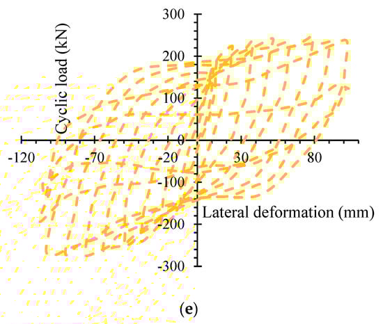 The results of the rotations () and ductility () of the specimens are shown in Table 5. , , and are the maximum and damage-parallel yielding compressions, correspondingly. The transverse deformations are , , and when compared to , , and , correspondingly. Rotation and ductility have shown a positive link. The ductility index ranged from 7.1 to 9.7, indicating 2 to 3 times more significance than the required value of three for the seismic elastic zone. A peak range of 0.035–0.059 is also more significant than the required value of 0.020. These findings show that plastic deformation performance is common in FGSTCs.