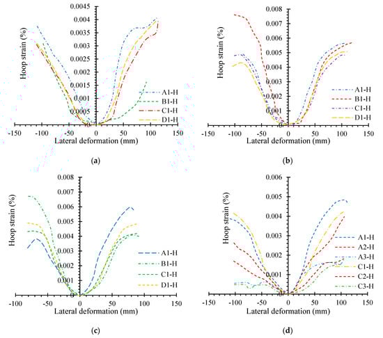 Hoop strains of GLT: (a) RAGC100-0.2-STT8 for similar elevation; (b) RAGC50-0.2-STT8 for the same elevation; (c) RAGC50-0.2-STT10 for diverse elevations; (d) RAGC50-0.4-STT8 for the same elevation.