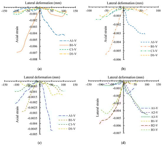 Axial strains of GLT: (a) RAGC50-0.4-STT8 for the same elevation; (b) RAGC0-0.2-STT8 for the same elevation; (c) RAGC100-0.2-STT8 for diverse elevations; (d) RAGC50-0.2-STT10 for the same elevation.