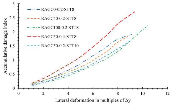 where D is the aggregate value; and are the peak deformations of the specimen under seismic behavior and uniaxial load, separately; equal as 0.62 [60]. Moreover, is the total plastic loss of energy of specimen; is the load capacity of the specimen at yielding, and β is the loop lateral load coefficient that may be determined with the RAGC replacement level. As seen in Figure 11, the simultaneous failure deformation graphs of each specimen tend to nonlinear turns of events. When the subjected force is in the early stages, the overall failure results of the specimen are minor and ameliorate at a slower rate as the deformation expands. The simultaneous failure of the specimens ameliorates when the load is at a later phase, essentially because the aggregate failure patterns are larger than one, indicating that the specimen failed spectacularly.