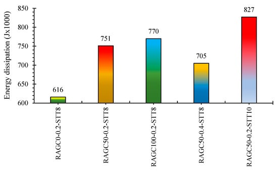 where refers to the specimen’s hysteresis loop, and refers to the total portion under that hysteresis loop. The size of each is calculated by using the area of all hysteresis loops is determined using PC programming. Figure 12 shows the absolute energy loss of all five specimens. The energy limit decreases rapidly as the RAGC replacement rate is ameliorated. When compared to a specimen made entirely of NAC the absolute energy spreading of specimens RAGC50-0.2-STT8 and RAGC100-0.2-STT8 are 22% and 25% higher, correspondingly. The specimen’s total energy dispersion is reduced by increasing the compression-load ratio. The energy loss of specimen RAGC50-0.4-STT8 is 7% lower than that of specimen RAGC50-0.2-STT8. The ability to dissipate energy capacity could be improved by increasing the STT ratio. The total energy dissipation of specimen RAGC50-0.2-STT10 is 8.3 × 105 J, which is 10% more than the total energy dissipation of specimen RAGC50-0.2-STT8.