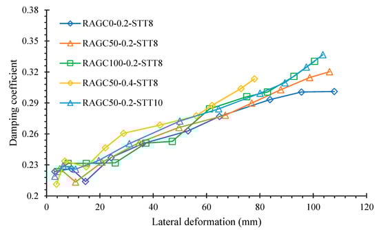 The viscous damping coefficients against the lateral deformation for the analyzed specimen are shown in Figure 13. Before the initiation of specimen yielding with no specific association with three testing variables, this metric had a value of 0.21. When the specimens begin to yield, this value improves as the deformation of each specimen ameliorates, indicating an amelioration in energy dissipation. When the specimen deformation is minor, the influence of the RAGC replacement rate on the coefficient of damping is very limited. However, when the deformation is larger, especially close to the damage deformation, the impact ameliorates. At the deformation of the deformation, the damping coefficients of specimens RAGC50-0.2-STT8 and RAGC50-0.2-STT10 are 6 percent and 8 percent higher than natural aggregate concrete specimen, correspondingly. The coefficient of the RAGC50-0.2-STT8 specimen was higher (5 percent higher than the coefficient of the RAGC50-0.4-STT8). In general, increasing the RAGC replacement rate and steel ratio, as well as lowering the compression load proportion, will improve energy dissipation. The results show that the damping coefficients for each specimen range between 0.21 and 0.32, which are satisfactory values, as these parameters should be between 0.1 and 0.2 for normal strength concrete columns. These findings show that the FGSTCs specimens have a higher energy dissipation capacity and better earthquake resistance under quasi-static stress.