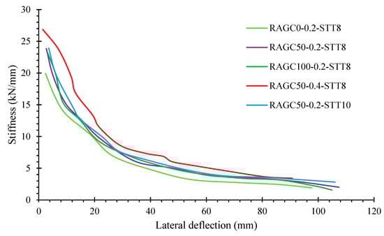 where and represent the highest loads in the positive and negative directions, correspondingly, during the major pattern of the phase of load; and and are the highest deformations in the positive and negative ways, individually, during the principal pattern of the phase of load application. As demonstrated in Figure 14, the deterioration of stiffness for each specimen may be generated by regulating secant stiffness alongside specimen deformation. The stiffness of the specimen ameliorated slightly as the RAGC replacement rate ameliorated. However, the RAGC replacement level had a minor influence during the deformation. In comparison to the specimen with a lower compression load proportion, the elastic stiffness of the specimen with a higher compression load contribution was more noticeable, but its stiffness decay was also more obvious through the latter load stage. Figure 14 demonstrates that the stiffness-deformation functioning of specimens with various STT ratios was similar, implying that the STT ratios utilized in these studies had only a minimal impact on stiffness reduction. For instance, the stiffness of the five specimens decreased more dramatically during the start of the load period than the late load phase, when it decreased steadily and without surprise.