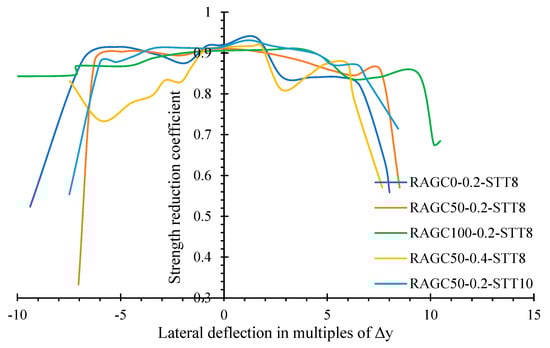 Meanwhile, the axial load capacity of the debasement constant, defined as the percentage of the peak compression of the last major loop of loads, can be used to explain the reduction in axial load-carrying capacity for each specimen under cyclic dumping and reload. Figure 15 depicts the relationship between the axial strength reduction coefficient and the specimen deformation. Because of the yielding and failure of the STT, the decreasing coefficient has a minimal index in the first load phase and then drops dramatically in the final load phase. The axial load-carrying capacity degradation patterns were compared between specimens with varying RCA substitution rates. Even though it provided a higher strength and higher strain of the RAGC, the axial load-carrying capacity debasement of specimen RAGC100-0.2-STT8 with total RAGC replacement was extremely limited. The axial load-carrying capacity loss for the specimen with the higher steel ratio was slightly reduced. In comparison to the influence of other parameters, high strength caused the axial strength to decrease more rapidly, hastening the RAGC and STT damage.