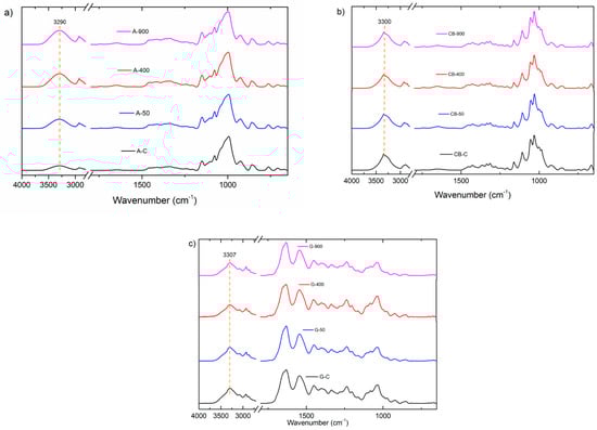 FTIR spectra of (a) starch films, (b) bacterial cellulose films, and (c) gelatin films subjected to plasma treatment.