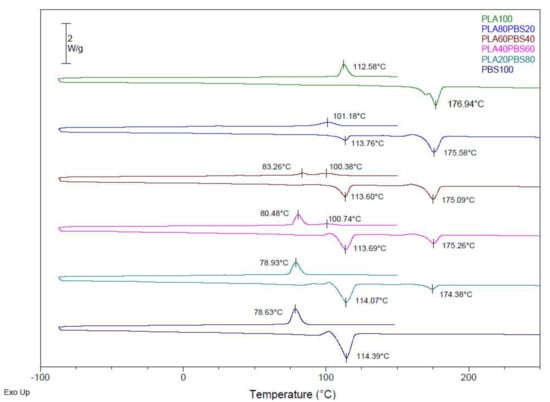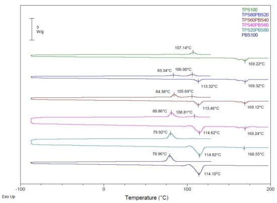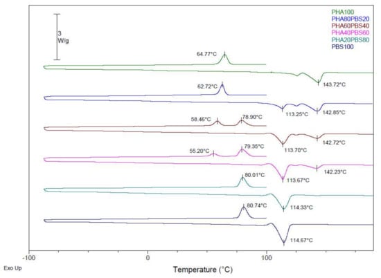 The calorimetric curves obtained for the blends of PLA, PHA, and TPS with PBS are shown in