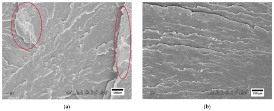 Figure 5b) revealed a lower number of fracture lines and a higher number of layers than PHA80PBS20. In addition, the fracture lines showed greater curvatures without appearing so brittle in the PHA80PBS20 formulation. For these reasons, it can be deduced that the observed small fragments resulted from the presence of PBS, and they became more abundant with increases in PBS content. Additionally, the increase in PBS provided ductility to the material, making the behaviour of the fractures in the PHA60PBS40 formulation more similar to ductile fractures.