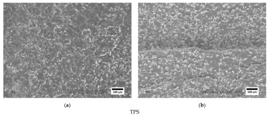 Therefore, the SEM analysis confirmed the lack of compatibility between the three polymers and the PBS revealed by the DSC analysis. The micrographs show phase separation in the case of the PLA/PBS formulations, as can be seen in the appearance of small sheets that are separated from the matrix and create a “delamination” in both the PHA/PBS and TPS/PBS formulations.