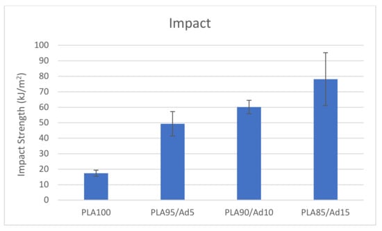 Figure 10, where a significant increase in impact strength can be observed as the additive content increased. A very ductile material that was capable of homogeneously distributing the energy of the impact throughout the piece before breakage was obtained. This can be attributed to the good chemical affinity between the PLA and the EVA-based additive.