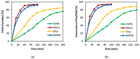 The results of the LC–MS analysis in Figure 1a show that methyl esters of each lactic or 3-hydroxybutanoic acid reach their reaction equilibria after about 90 min of depolymerization (MeLawas slightly faster than M3HB), resulting in yields of 93.8% for MeLa and 91.6% for M3HB. On the other hand, the ethyl esters of both carboxylic acids did not reach their total yield value after 4 h of reaction. The reaction rate of ethyl 3-hydroxybutyrate seems to be the slowest, reaching a yield of 76.0% after 240 min. The ethyl lactate’s yield after the same reaction time reached 85.1%. The differences between the product yields could be caused by the steric effects of the particular molecules involved in the reaction.