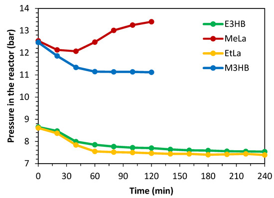 The pressure of the reacting mixture was monitored during every alcoholysis. The results shown in Figure 2 confirm the progressing depolymerization for each mixture. Due to the incorporation of alcohol into the structure of the alkyl ester, the pressure in the system should decrease as a result of decreasing the presence of evaporating alcohol. These expectations are fulfilled except for the methyl lactate. The pressure of the system for the methanolysis of PLA increases after 45 min of reaction. This elevation is caused by the forming MeLa since the reaction temperature was 151 °C and the boiling point value of MeLa is below this temperature (shown in Table 1). Therefore, the occurring monoester participates in the pressure increase.