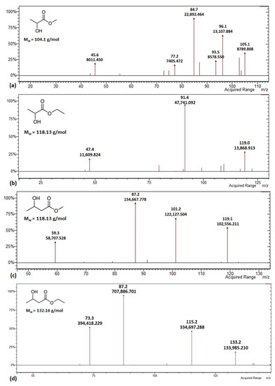MS spectra of the synthesized alkyl monoesters based on PLA and PHB. (a) Methyl lactate (MeLa); (b) Ethyl lactate (EtLa); (c) Methyl 3-hydroxybutyrate (M3HB); (d) Ethyl 3-hydroxybutyrate (E3HB).