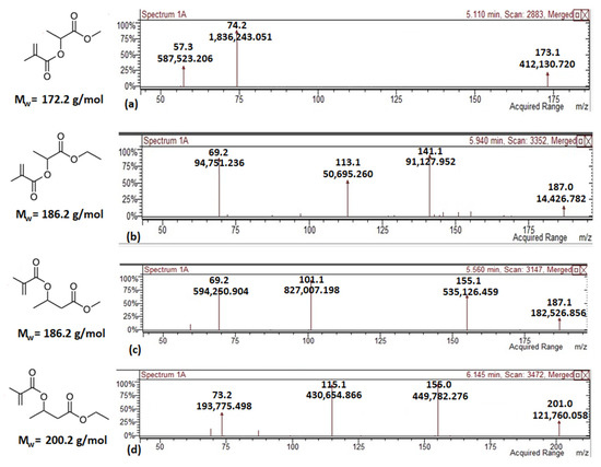 MS spectra of the synthesized methacrylated alkyl esters of lactic acid or 3-hydroxybutanoic acid. (a) Methacrylated methyl lactate (MeLaMMA); (b) methacrylated ethyl lactate (EtLaMMA); (c) methacrylated methyl 3-hydroxybutyrate (M3HB); (d) methacrylated ethyl 3-hydroxybutyrate (E3HB).