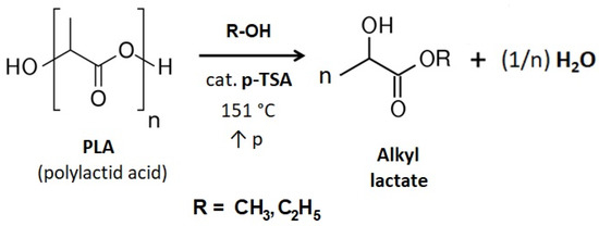 Alcoholysis of polylactic acid (PLA) catalyzed by p-TSA (↑ p means pressure’s increase).