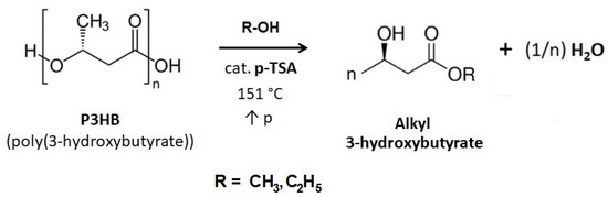Alcoholysis of poly(3-hydroxybutyrate) (PHB) catalyzed by p-TSA (↑ p means pressure’s increase).