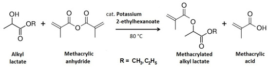 Synthesized alkyl esters of either lactic acid or 3-hydroxybutanoic acid did undergo a reaction with methacrylic anhydride (MAA) in order to form a polymerizable monomer. The reaction mixtures were prepared in a molar ratio 1:1 (ester:MAA) (see Scheme 3 for lactates and Scheme 4 for 3-hydroxybutyrates). The reaction mixture was poured into a three-necked round bottom flask and placed in an oil bath tempered at 80 °C and stirred via a magnetic stirrer. The reactions were catalyzed by a 50% solution of potassium 2-ethylhexanoate in 2-ethylhexynoic acid (2-EHA) that was prepared via a neutralization reaction of 2-ethylhexanoic acid with potassium hydroxide in a mass ratio 1:2 (KOH:acid) while the reaction water was evaporated. The catalyst was added to the mixture in a molar ratio 1:0.02 (ester:catalyst). The reaction started the moment the catalyst was added and all reactions took 24 h of reaction time. The conversions of reactants and the yields of forming products were monitored via GC-FID analysis. The formed methacrylic acid was neutralized by potassium hydroxide aqueous solution and separated from the metracrylated product. Methacrylated alkyl ester structures were verified via MS, FT-IR, 1H NMR, and13C NMR methods.