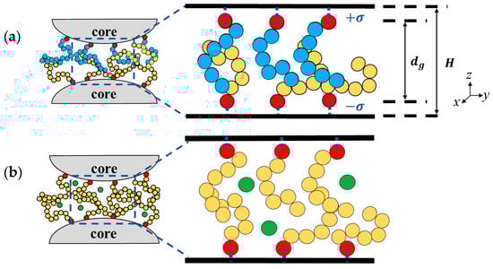 Neglecting the nanoparticle curvature, we consider the grafting of polymer brushes on two opposing flat walls representing the surfaces of two nearby polymer-grafted particles [28]. The two model systems considered in this investigation are shown in the schematic diagrams in Figure 1. In Figure 1a, the interacting brushes composed of different polymers are in a pure, solventless state. In Figure 1b, free molecules are present in the interstices of homopolymer brushes. The interstitial space between the two flat walls is in the z direction and periodic boundary conditions are used in the x and y directions. The polymer chains, each consisting of N monomers, are grafted in a uniform square lattice with a grafting density of . The wall is modeled as a particle-less smooth wall [49] with an area of ; the number of chains is determined by . The bottom wall is located at and the grafting monomers are fixed at . The grafting monomers on the top wall are fixed at and the top wall is located at . The gap thickness H is the distance between the top and bottom walls (). As the polymers are grafted to inorganic core surfaces, the unfavorable mutual interaction between them is modeled by the repulsive Weeks–Chandler–Andersen (WCA) potential [50],