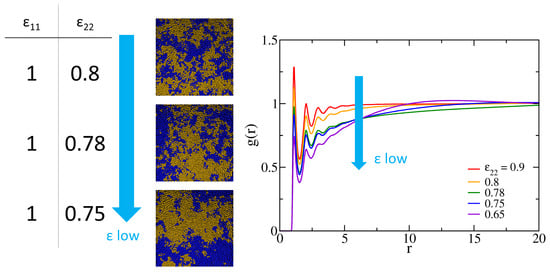 Left: simulation snapshots of binary blend systems at different values of the LJ potential well for the second polymer type. Chains of two colors denote two different polymer types. Right: the simulated radial distribution function between monomer beads for various based on the one-fluid approximation [59].
