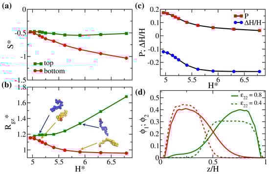 The two-stage variations in the chain configurations of the two brushes suggest that the polymers cooperate to fill the space. In Figure 3d, we compare the profiles for the AC and AH systems, corresponding to systems with small and large values of , respectively. It can be seen that, when (AC system), the two brush profiles are quite symmetric, with a tail region for brush C extending to the opposite wall, allowing sufficient mixing between the two polymers. In contrast, when is as small as 0.4 (AH system), brush H displays a highly stretched profile while brush A collapses to limit the inter-brush mixing. The variations of the chain configuration are also illustrated in the representative snapshots for a pair of grafted polymers in Figure 3b. Even for such asymmetric brush profiles, a portion of the brush still penetrates the opposing one. From the variation in the degree of interpenetration in Figure 3c, apparently, as increases with , P decreases accordingly. In order to more directly compare how the chain configuration impacts the inter-brush mixing, we introduce a second indicator to quantify the degree of interpenetration: , where is the average end-to-wall distance of the polymer i with or 2. We observe that the normalized shows the same trend as P. Similar to for polymer one, eventually flattens as . As is significant, the increase in the gap thickness is indeed attributed to the stretching of polymer two while the degree of interpenetration almost remains constant. Finally, in Figure 3a, as increases, the scaled configurational entropy of the lower brush decreases monotonically because the brush configuration becomes more and more limited. Conversely, the competition between the effect of inter-brush mixing and chain stretching in the presence of the phantom solvent yields subtle variation in the entropy of polymer two.