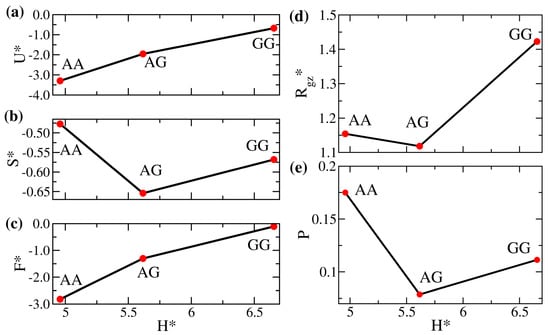 (a) Scaled internal energy per bead (), (b) scaled entropy per bead (), (c) scaled free energy per bead (), (d) ratio of the z-component actual gyration radius to the reference gyration radius (), and (e) degree of the interpenetration of polymers (P) versus the dimensionless gap thickness () of AA, AG, and GG systems.