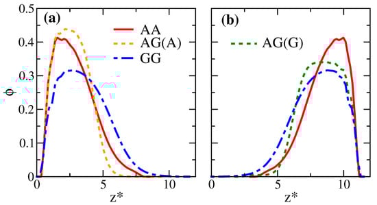 Local volume fraction distributions of the polymer beads () plotted along the scaled position for systems AA, AG, and GG. The distributions of the bottom brush are shown in (a); those for the upper brush are shown in (b). The dashed curves in (a,b) correspond to the profiles of brush A and brush G in the binary system, respectively. For clarity and easy comparison, the brush profiles in (b) are shifted horizontally to make all curves start from the same .
