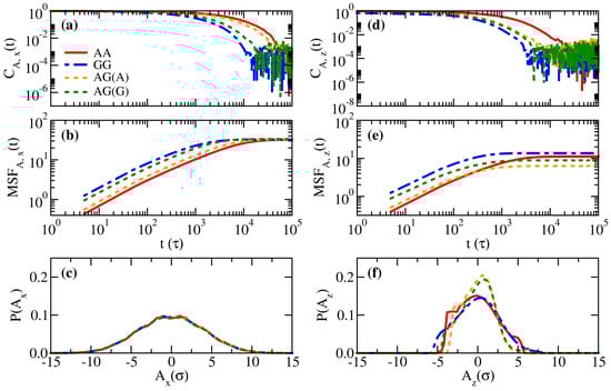 Comparisons of the normalized end-to-end fluctuation autocorrelation functions (), the mean square displacements of the end-to-end fluctuation (), and the probability distribution functions of the end-to-end fluctuation () for systems AA, AG, and GG in the parallel direction, (a–c), and the perpendicular direction, (d–f).