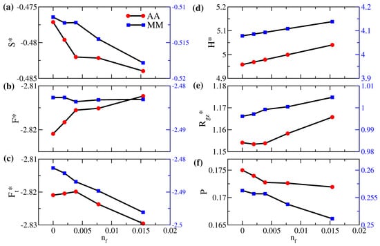 (a) Scaled entropy per bead (), (b) scaled free energy per bead for polymer brushes (), (c) scaled total free energy per bead (), (d) scaled gap thickness (), (e) degree of interpenetration of polymers (P), and (f) ratio of the z-component actual gyration radius to the reference gyration radius () as a function of the number fraction of free particles () for brushes AA (red circles; left axis) and MM (blue squares; right axis). The two vertical axes are fixed at the same range of values.