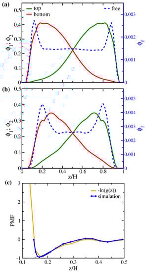 To investigate the potential energy landscape of the free particles among the brushes, we choose the system MM+400 (400 free particles added to the brushes MM) as the representative and calculate the potential of the mean force (PMF) of a single free particle along the z-direction using Equation (7). For a bulk fluid, the PMF is related to the radial distribution function in terms of a Boltzmann factor [60]. In the same spirit, the PMF of the free particle at z can also be defined by the corresponding distribution function via . As in our simulations, we simply compute and compare the result to the PMF in Figure 8c. The close agreement between the two profiles not only justifies the correctness of our simulation protocols but also implies that the distribution of free particles is directly governed by the potential field felt by them within the gap. The two potential wells around and in Figure 8c correspond to the near-wall grafting site and the mixing region in the center of the gap, respectively. This again suggests that two entropic factors drive the uptake of solutes—packing in the free volume at the polymer–surface interface and the polymer–solute mixing at the chain ends.
