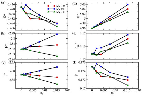 (a) Scaled entropy per bead (), (b) scaled free energy per bead for polymer brushes (), (c) scaled total free energy per bead (), (d) scaled gap thickness (), (e) degree of interpenetration of polymers (P), and (f) ratio of the z-component actual gyration radius to the reference gyration radius () as a function of the number fraction of free particles () for brushes AA at (red circles), 0.5 (blue squares), and 1.5 (green triangles).